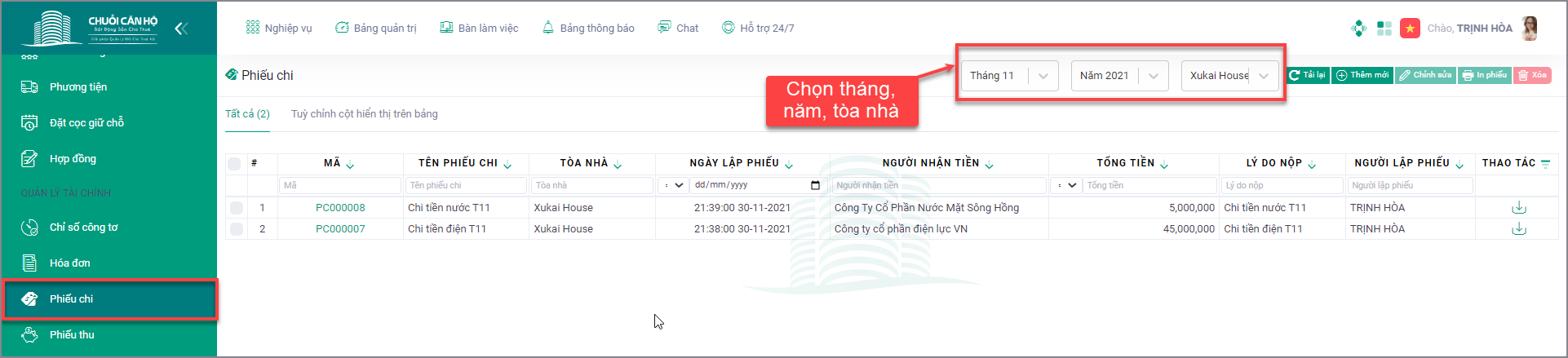 Tại màn hình giao diện là danh sách phiếu chi có trong tòa nhà. Trên thanh thao tác là danh sách phiếu chi lọc theo tháng, năm, tòa nhà và danh sách các thao tác có trong chức năng Phiếu chi (Thêm mới, chỉnh sửa, In phiếu, xóa). Quý anh (chị) thực hiện lọc và chọn tab phù hợp với mục đích tìm kiếm và sử dụng thông tin.