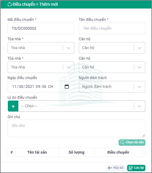 Căn hộ (dòng số 3): chọn trong danh sách căn hộ (thuộc tòa nhà đã chọn ở trên) cần điều chuyển tài sản đến. Nếu không chọn căn hộ nào thì được hiểu là tài sản được điều chuyển đến tòa nhà đã chọn.